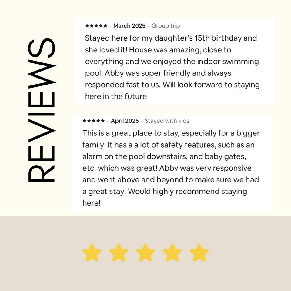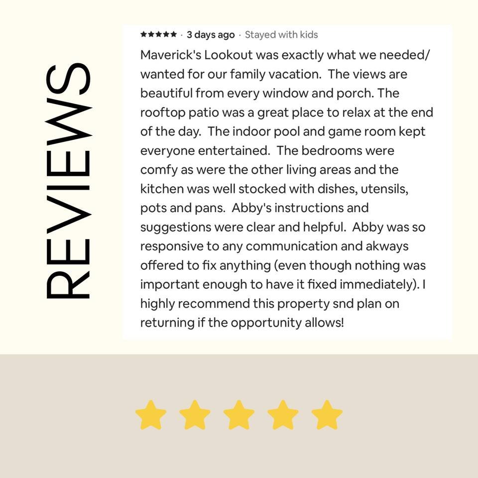 Welcome to Maverick's Lookout, where every detail has been thoughtfully designed to create the perfect escape for all ages! This luxurious cabin offers plenty of space, modern amenities, and unbeatable comfort to ensure your stay is unforgettable. See the floor plan in the photos! The MAIN LIVING area features a cozy fireplace, a full kitchen equipped for family meals, and multiple decks that allow you to enjoy the beauty of the Smokies from every angle. There’s no shortage of room to gather, laugh, and make memories with loved ones. ★ LIVING ROOM ★ ✔Vaulted Ceiling ✔ 2 Sofas with Pillows ✔ Smart TV ✔ Electric Fireplace ✔ Designer Coffee Tables & Reading Lamps ✔ Access to the Upper Deck : 4 Chairs ★ KITCHENS & DINING ★ Kitchen Aid Appliances: ✔Microwave ✔ Stove ✔ Oven ✔ Double-Door Refrigerator/Freezer KITCHEN OTHER: ✔ Toaster ✔ Air Fryer ✔ Coffee Makers (Keurig Machine & Drip Coffee) ✔ Sink - Hot & Cold Water ✔ Plates ✔ Glasses & Mugs ✔ Silverware ✔ Pots & Pan ✔ Salt, Pepper, Oil ✔ Seasonings ✔ First Aid Kit & CPR Kit under sink You will find a half-bath behind front door entrance. ✔ Dining Table with Seating for 8 ✔ Waterfall Kitchen Island with Seating for 4 On the FIRST floor, you’ll find a KING bedroom with a LARGE walk-in shower, perfect for unwinding after a day of adventure. Head UPSTAIRS to discover THREE more BEDROOMS, including TWO QUEEN rooms and a QUEEN BUNK room—each with its own private bathroom for ultimate convenience. Additionally, two half baths are located throughout the cabin for easy access. ★ SLEEPING ARRANGEMENTS–4 BEDROOMS ★ ✔ First Floor : Master Bedroom: King Size Bed ✔ Second Floor: Bedroom 2: Queen Size Bed ✔ Second Floor: Bedroom 3: Queen Size Bed ✔ Second Floor: Bedroom 4: Queen Size BUNK BED + Another Queen Size BUNK (4 mattresses total) EACH BEDROOM YOU CAN FIND: ✔Premium Pillows, Linens, and Sheets ✔ Smart TVs ✔ Dressers with Spacious Drawers ✔ Night Stands with Reading Lamps ✔Bathroom with each bedroom ★ MASTER BATHROOM ★ ✔ GIANT Tile Walk-In Shower with SPA-LIKE Shower Heads ✔ Single Vanity ✔ LED Mirror ✔ Toilet ✔ Towels ✔ Hair Dryer ✔ Essential Toiletries : Q-tips, Cotton Pads, Tampons/Pads COMPLIMENTARY: ✔Eye Mask ✔ Shower Steamer Tablet ✔Make-up Wipe ★2 & 3 QUEEN BATHROOM ★ ✔ Tile Walk-In Shower ✔ Single Vanity ✔ LED Mirror ✔ Toilet ✔ Towels ✔ Hair Dryer ✔ Essential Toiletries : Q-tips, Cotton Pads, Tampons/Pads COMPLIMENTARY: ✔Eye Mask ✔ Shower Steamer Tablet ✔Make-up Wipe ★4 QUEEN BUNK BATHROOM ★ ✔ Tile Shower with Tub ✔ Single Vanity ✔ LED Mirror ✔ Toilet ✔ Towels ✔ Hair Dryer ✔ Essential Toiletries : Q-tips, Cotton Pads, Tampons/Pads The heart of the fun is DOWNSTAIRS, where the INDOOR POOL is ready for year-round enjoyment. The same level boasts a MOVIE ROOM and GAME ROOM, making it the ultimate hangout spot for everyone. ★ GAME ROOM ★ ✔Smart TV ✔ Mrs.Pacman Arcade Game ✔ Xbox System : 2 Remotes + Game Pass ✔️ Nintendo Switch : 4 Remotes ✔ 3 Gaming Chairs ✔ Gaming Lights ★ COZY MOVIE ROOM ★ ✔Smart TV ✔Sound Bar ✔ Several Board Games ✔ Bar Cart ✔ Access to Lower Deck : 4 Chairs ✔ Gaming Lights Half Bathroom in Hallway with close access to the pool! Laundry + Ironing Board + Iron If you're looking to RELAX outdoors, head to the ROOFTOP lounge—our favorite space—complete with incredible views and the perfect setting for morning coffee or evening stargazing. ★ ROOFTOP ★ ✔Smart TV ✔Electric Fireplace ✔ Hot Tub ✔ Yoga Mats + Accessories ✔ Lounge Couch + Chairs ✔ Table with 6 Chairs ✔Grill The LOCATION is unbeatable! Dollywood is just about 12-14 minutes away (depending on traffic), and The Island in Pigeon Forge is 8 minutes, putting shopping, dining, and entertainment right at your fingertips. Whether you're splashing in the pool, enjoying a movie night, or taking in the mountain views from the rooftop, this cabin offers everything you need for a fun and relaxing getaway. It’s the perfect place to create unforgettable memories with family and friends!